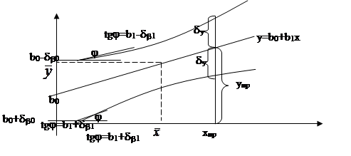Совокупность доверительных интервалов для всех х из области прогнозов образует доверительную область, которая представляет область заключения между двумя гиперболами. Наиболее узкое место в точке