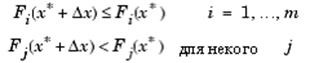 Отметим, что поскольку F(x) является неким вектором, то любые компоненты F(x) являюся конкурирующими и отсутсвует некое единое решение поставленной задачи. Взамен этого, для описания характеристик целей вводится концепция множества точек неулучшаемых решений (так называемая оптимальность по Парето).Неухудшаемое решение есть такое решение, в котором улучшение в одной из целей приводит к некому ослаблению другой. Для более точной формулировки данной концепции рассмотрим некую область допустимых решений
