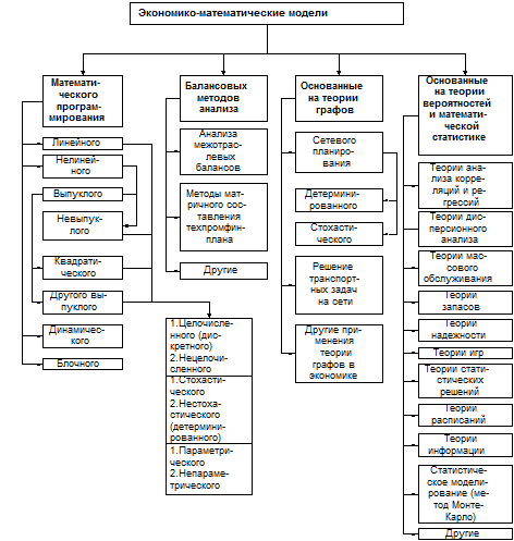 Перечисленные виды моделей относят обычно к группе детерминированных моделей, хотя некоторые из них могут быть связаны с расчетами на основе применения элементов математической статистики и теории вероятностей, например, стохастическое программирование или стохастическое сетевое планирование. Другую большую группу экономико-математических моделей, применяемых при оптимизации управленческих решений, составляют стохастические модели или модели, основанные на теории вероятностей и математической статистике. К стохастическим моделям относятся модели теории анализа корреляций и регрессий, теории дисперсионного анализа, теории массового обслуживания, методов статистических испытаний, теории игр, теории статистических решений, теории информации, теории надежности, теории расписаний, теории запасов и др.