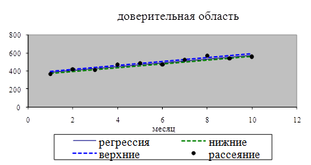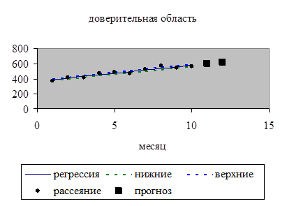 12. С помощью линейной парной регрессии сделать прогноз величины прибыли на ноябрь и декабрь месяц и нанести эти значения на диаграмму рассеяния. Сопоставить эти значения с границами доверительной области для условного математического ожидания М(