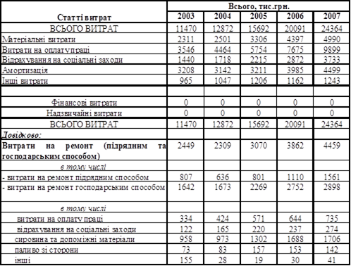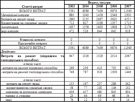Таблиця 1Витрати по статтям собівартості у тому числі на ремонт (за рік 2003-2007 рр.)