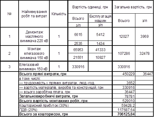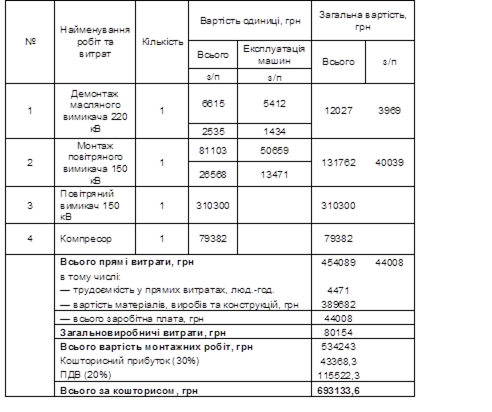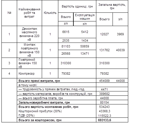 Таблиця 4 Капітальні витрати на монтаж повітряного вимикача