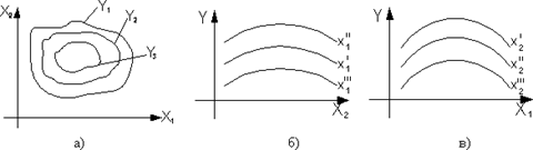 Рис. 3. Сечения поверхности отклика при фиксированных откликах (а) и переменных (б, в)