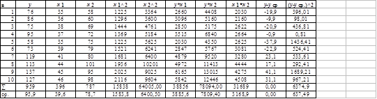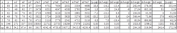 Получим: x1 = 54,2, х2=67,4, х3= 66; у*х1=3617; у*х2=4542,4; у*х3=4750,6; х1*х2=3657,2; х1*х3=3415,8; х2*х3= 4256,4
