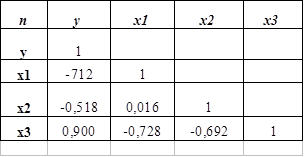 Рассчитаем r коэффициент корреляции между величинами у и х1; у и х2; у и х3; х1 и х2; х2 и х3; х1 и х3;
