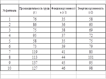 Б. Построить модель множественной линейной регрессии производительности труда от факторов фондо- и энерго- вооруженности, найти все коэффициенты корреляции и детерминации, коэффициенты эластичности и - коэффициенты, пояснить экономический смысл всех коэффициентов.