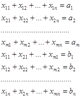 Такая структура системы (3. ) позволяет легко установить ее ранг. Действительно, покажем, что совокупность неизвестных, образующих первую строку и первый столбец матрицы перевозок, можно принять в качестве базиса. При таком выборе базиса, по крайней мере, один из двух их индексов равен единице, а, следовательно, свободные неизвестные определяются условием