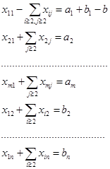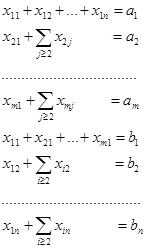 В системе (3. ) выделен указанный выше базис: базисные неизвестные из первых т уравнений образуют первый столбец матрицы перевозок, а базисные неизвестные остальных уравнений образуют первую строку матрицы перевозок без первого неизвестного