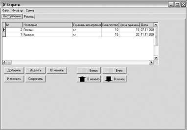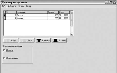 При нажатии на форме 1 в строке меню пункта «Фильтр» открывается список, где можно выбрать «Фильтр поступления» и «Фильтр использования». При нажатии на один из этих пунктов открывается соответствующая форма 5 или 6.