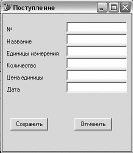 На этой форме располагаются компоненты BitBtn, которые служат для навигации по таблице, компонент MainMenu, который используется для переключения между другими формами и компоненты Button – используются для управления базой данных (добавление, редактирование, удаление, сохранения данных). Компонент PageControl используется для переключения между таблицей поступление и таблицей использование. Также при нажатии кнопки «Добавить» происходит открытие формы 3 (рис. 5), которая служит для внесения данных в базу данных поступление. На форме 3 для внесения данных служат компоненты DBEdit.