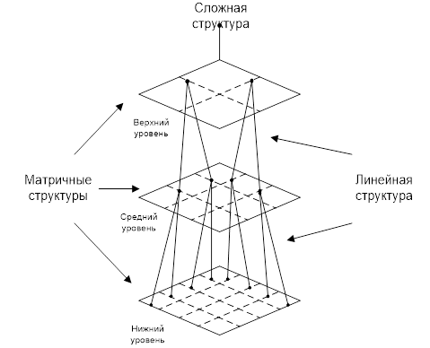 Под сложнойструктурой понимается многопараметрическая матричная организация, отдельные звенья которой упорядочены по принципу иерархии. Система сочетает достоинства как линейной, так и матричной организации. На рис. 1 представлена графическая интерпретация проектирования сложной организационной структуры, включающую среди своих элементов также матричную и линейную структуру.
