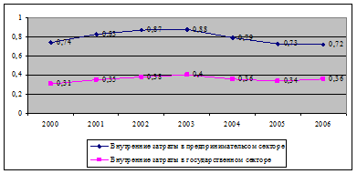 Если в 1991 г, значительная часть ВВП РФ приходилась на товары — 60,5%, то по результатам 2007 г. товарная часть составила всего лишь 35,3%. За этот же период доля услуг в ВВП выросла с 32,6 до 51,9%. Налоговые поступления увеличились, но незначительно (на 4,8%). То есть за 16 лет реформ абсолютная величина национального ВВП практически не изменилась (1,27 трлн долл в 2007 г. и 1,22 трлн долл в 1991 г.). Произошло лишь его перераспределение — увеличилась доля услуг. Товарная составляющая ВВП является приоритетной. По ней можно судить о состоянии производства, уровне научно-технического прогресса, возможностях государства выполнять свои социальные функции, строить прогнозы и выстраивать долгосрочную политику.