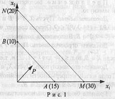 Пример 3. Отношение равной стоимости разбивает все пространство товаров на непересекающиеся классы (для случая двух товаров см. рис. 1). Пусть вектор цен есть (2, 3), тогда класс наборов стоимости 30 есть отрезок АВ, а стоимости 60 есть отрезок MN. Стрелка показывает направление увеличения стоимости наборов. В качестве этой стрелки можно взять вектор цен.