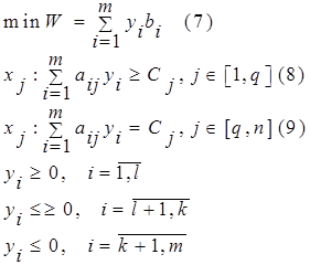 По аналогии можно записать условия двойственной задачи при решении задачи минимизации. Для удобства пользования некоторые соотношения при переходе от прямой задаче к двойственной приведены в таблице.