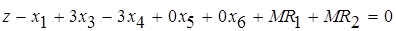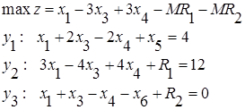 Полученный вид ЗЛП не позволяет сформировать начальный допустимый базис, т. к. нельзя выделить единичные орты во втором и третьем равенствах. Для получения начального допустимого базиса введём искусственные переменные. В результате получим: ![]()