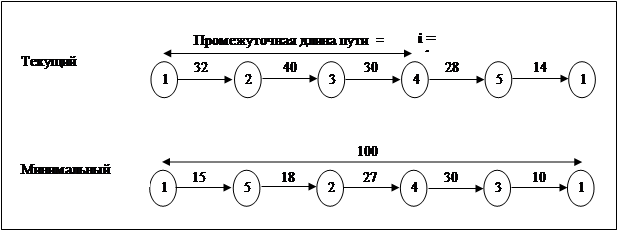 Для пояснения моего варианта решения задачи следует ввести несколько понятий. Промежуточную длину пути можно определить следующим образом: представим, что торговец выбрал какой-либо путь; он вышел из первого города и сейчас находится в каком-то городе i . Тогда все пройденное расстояние из начала в город i будем называть промежуточная длина пути. Если исходить из того, что торговец в каждый момент времени будет находиться в каком-то i -ом городе, то всегда можно подсчитать какое расстояние он прошел из начала до этого города, то есть промежуточную длину пути.