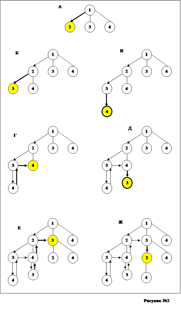 Следует рассмотреть один из основных моментов алгоритма, связанных с перебором маршрутов. Из рисунка №2 можно проследить порядок формирования путей и рассмотреть на конкретном примере, как работает алгоритм. Здесь приведен пример для 4 городов. Остановимся на рисунке по подробнее.