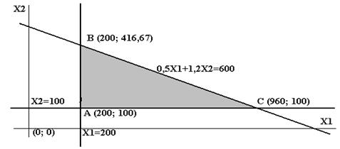 Для построения линии, задающей ограничение 0,5·X1 + 1,2·X2 ≤ 600, удобно записать его в виде равенства: 0,5·X1 + 1,2·X2 = 600. Выразим одну из переменных через другую: X2 = -0,417·X1 + 500. Это уравнение прямой. Построим эту прямую. Она разбивает координатную плоскость на две полуплоскости. В одной из этих полуплоскостей находятся точки, удовлетворяющие ограничению, в другой – не удовлетворяющие. Чтобы найти полуплоскость, удовлетворяющую ограничению 0,5·X1 + 1,2·X2 ≤ 600, подставим в него координаты любой точки, например, (0; 0). Для этой точки ограничение выполняется. Значит, она находится в полуплоскости, удовлетворяющей ограничению.
