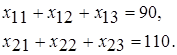 Составим систему ограничений задачи. Сумма всех перевозок, стоящих в первой строке матрицы Х, должна равняться запасам первого поставщика, а сумма перевозок во второй строке матрицы Х – запасам второго поставщика: