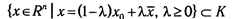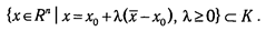 Множество К называется конусом с вершиной в точке x0 , если x0 € К , и из того, что некоторая точка х принадлежит К ( х € К ), следует, что в К содержится и луч, начинающийся в х0 и проходящий через х, т. е.