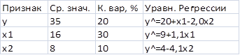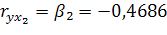 По этой формуле получаем в первом уравнении β₁=0,6857, β₂=-0,2286, во втором уравнении β₁=0,7543, в третьем уравнении β₂=-0,4686. Из стандартизированных уравнений находим для первого уравнения