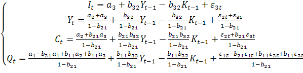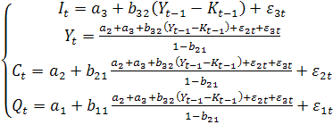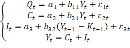В соответствии с необходимым условием идентификации D+1=H первое и второе уравнения сверхидентифицируемы (H=2, D=2), третье уравнение идентифицируемо (H=1, D=0), четвертое уравнение является тождеством и в проверке не нуждается.