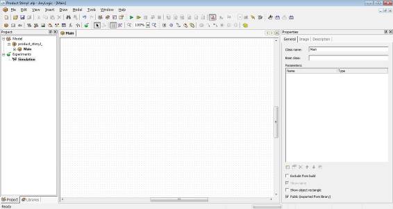 Создали новый проект. В центре появилась структурная диаграмма в центре рабочей области AnyLogic, окно Проект – в левой панели, и окно Свойства в правой.