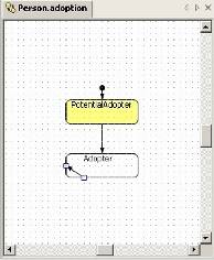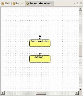 В окне Свойства, зададим новое Имя стейтчарта: adoption. Щелкнем мышью по состоянию state, нажмем F2 и переименуем состояние в PotentialAdopter. Это начальное состояние, о чем свидетельствует указатель начального состояния, направленный в это состояние. Если стейтчарт будет находиться в этом состоянии, то это будет означать, что этот человек еще не купил продукт. Нарисуем следующий стейтчарт рис 7.