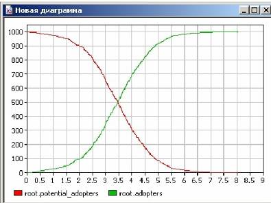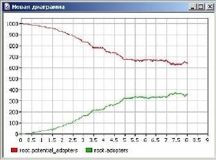 Затем перезапустили модель, поочередно щелкнув мышью по кнопкам панели инструментов Перезапустить и Запустить. Диаграмма показывает, как изменяются переменные potential_adopters и adopters во время моделирования.