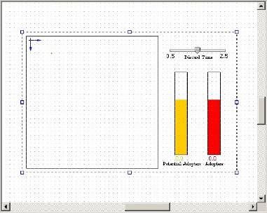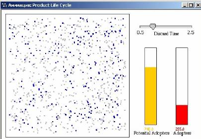 Теперь добавим на анимацию индикаторы, с помощью которых будем отслеживать, сколько людей приобрело продукт, а сколько – нет. Добавим индикатор числа потенциальных потребителей продукта. Щелкнем мышью по кнопке панели инструментов Столбцовый индикатор. Поместим индикатор на анимацию, щелкнув мышью справа от прямоугольника исследуемой области. На вкладке Общие окна Свойства, изменим размер индикатора: х – 350, у – 80, ширина – 30, высота 200. На вкладке Столбцовый индикатор окна Свойства, выбирали переменную, которую будет отображать этот индикатор: positional_adopters.