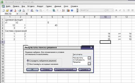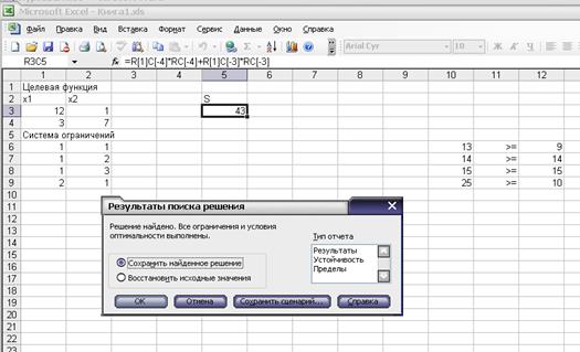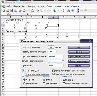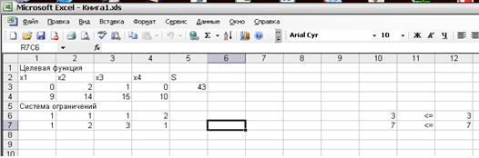 Постановка задачи осуществляется посредством задания ячеек для переменных и записи формул с использованием этих ячеек для целевой функции и системы ограничений.