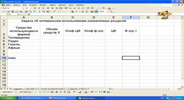 - курсор в ячейку В19. В данную ячейку будет помещаться значение целевой функции после решения задачи;