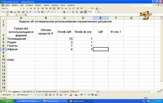 3. Ввести исходные данные задачи в созданную форму – таблицу, представленную на рис.1.2.