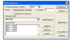 • ввести направление целевой функции равной – Максимальному значению ;