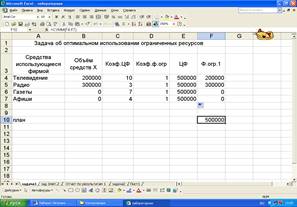 Полученное решение означает, что фирма может получить наибольшую прибыль, если распределит рекламный бюджет равный 500000 у.е. следующим образом: 200000 – телевизионная реклама; 300000 – радиореклама.