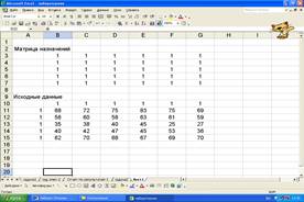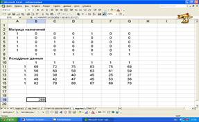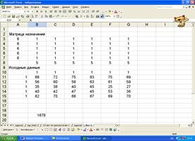 В данной задачи осуществляется ввод продавцов на различных торговых точках (в ячейки А11:А15 вводится «1»), потребности в заполнении вакантной должности («1» - в B10:G10), ввод производительности труда конкретного продавца при проведении оценки деятельности каждого продавца в каждой торговой точке ( блок B11:G15) (Рис.1.6.).