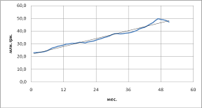 Основная цель создания моделей экономической динамики – сделать прогноз развития изучаемого процесса на предстоящий промежуток времени. Прогнозирование социально-экономических показателей на основе временного ряда относится к одномерным методам прогнозирования, базирующимся на экстраполяции, т.е. на продлении на будущее тенденции, наблюдавшейся в прошлом. При таком подходе предполагается, что прогнозируемый показатель формируется под воздействием большого количества факторов. Выделить все факторы обычно невозможно, к тому же по значениям факторов часто отсутствует информация. В этом случае ход изменения данного показателя связывают не с факторами, а с течением времени, что проявляется в использовании одномерных временных рядов. То есть, используется максимально возможный уровень агрегированности действующих факторов.[1]