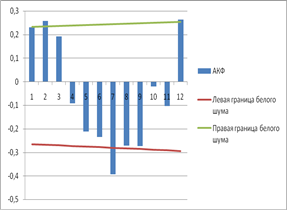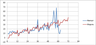 Характеризуя данный рисунок, хочется отметить, что наша модель достаточно точно повторяет исходный временной ряд. Исключение составляет лишь последний период, а именно значения первых трех месяцев 2009 года. В целом, можно сделать вывод, что модель прошла проверку на адекватность. Однако на этом все проверки не оканчиваются.