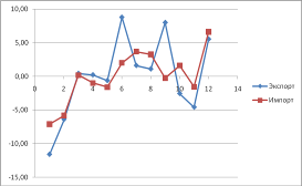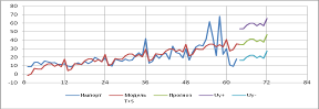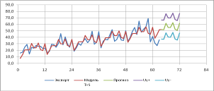 Также, исследование показало, что не все модели могут быть использованы для адекватного прогнозирования. Например, в нашем случае при декомпозиции временных рядов экспорта и импорта товаров выявилось наличие трех характеристик – тренда, сезонности и цикличности, отсюда появилась возможность использовать динамическую модель для прогнозирования – Тренд-сезонную модель, основанная на экстрополяционных методах прогнозирования, в основе которых лежит предположение о том, что основные факторы и тенденции, имевшие место в прошлом, сохранятся в будущем, дала адекватные значения прогноза. Очевидно, модель уловила наличие и сохранение тенденций временного ряда, что явилось непременным условием успешного прогнозирования в условиях нестабильности экономики.