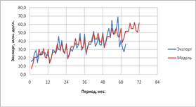 Как видно по графику интервальный прогноз довольно широк, но это получилось вследствии сильного падения объемов экспорта в 3 последние месяца моделирования. Отсюда повышается ошибка прогнозирования ирасширяется интервал.