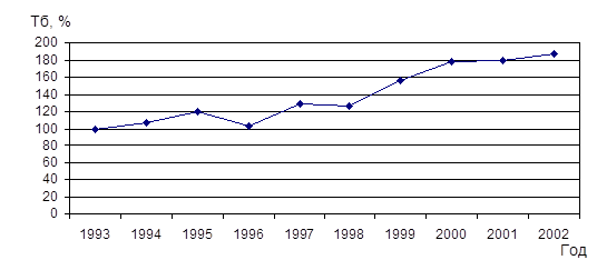 Таблица 3 - Динамика производства продукции промышленными предприятиями области за 1993 - 2002 г. г.