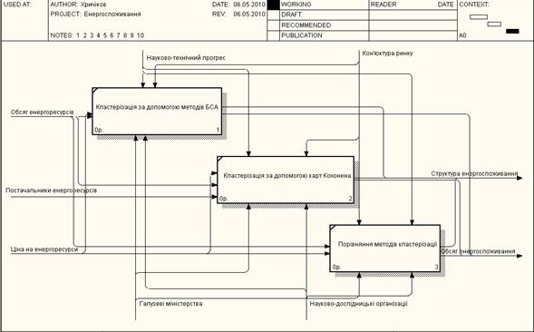 В результаті роботи запропонована модель аналізу споживання регіонами енергоресурсів із застосуванням комплексу моделей направлених на виділення груп, це модель кластеризації багатовимірного статистичного аналізу та карти Кохонена. Також проведена оцінка енергоспоживання, а саме за допомогою моделі дискримінантного аналізу, виконаної в пакетах Statistics та Excel, що дозволяє дослідити вплив факторів - показників на відношення регіону до певної групи відносно рівня його енергоспоживання.
