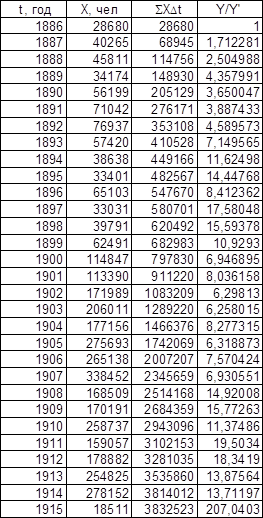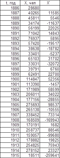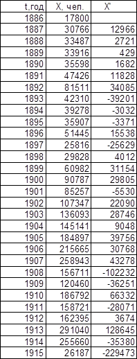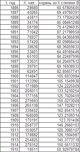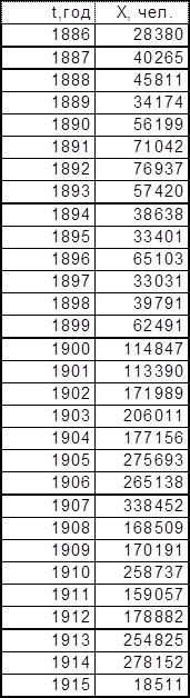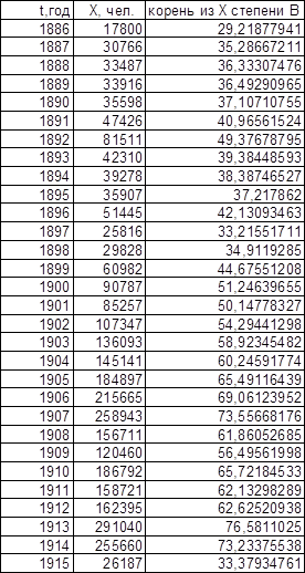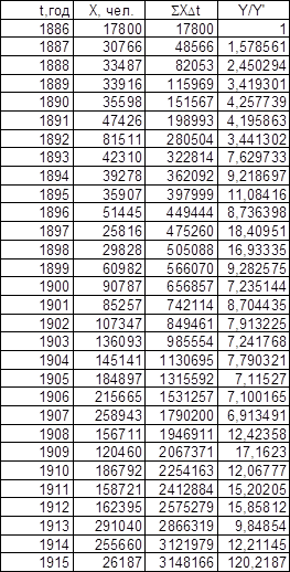 Для значений t0 (t – t0 = T1, t0 = 1877 для последовательности Эмиграция в США из Центральной Европы, t0 = 1875,5 для последовательности Эмиграция в США из СССР и стран Балтии), полученных при исследовании графиков обратного темпа роста интеграла эмпирической последовательности, графики имеют вид, представленный на листе 7 (см. Приложение).