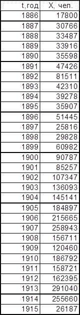 В качестве исходных последовательностей взяты статистические данные из книги «Историческая статистика Соединенных Штатов Америки» – Эмиграция в США из Центральной Европы с 1886 по 1915 год и Эмиграция в США из СССР и стран Балтии с 1886 по 1915 год.