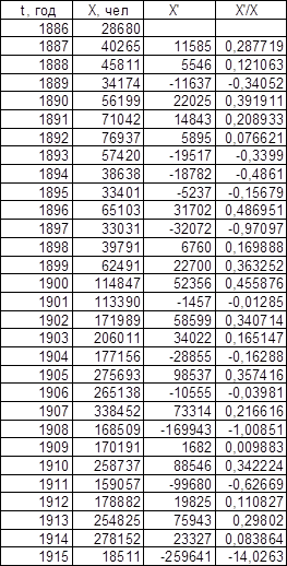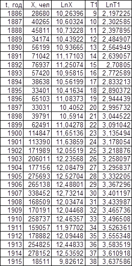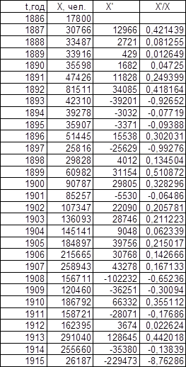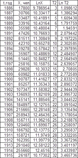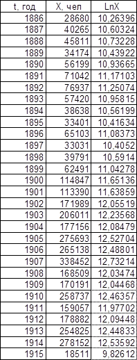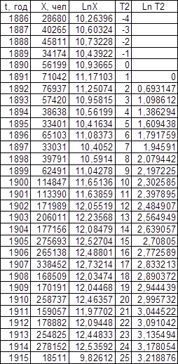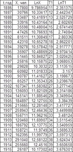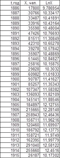 Графики зависимости lnX от t представлены на листе 2 (см. Приложение). Темп роста К, определенный по графикам, равен для графика зависимости Эмиграции в США из Центральной Европы – 0,11, для графика зависимости Эмиграции из СССР и стран Балтии – 0,13.