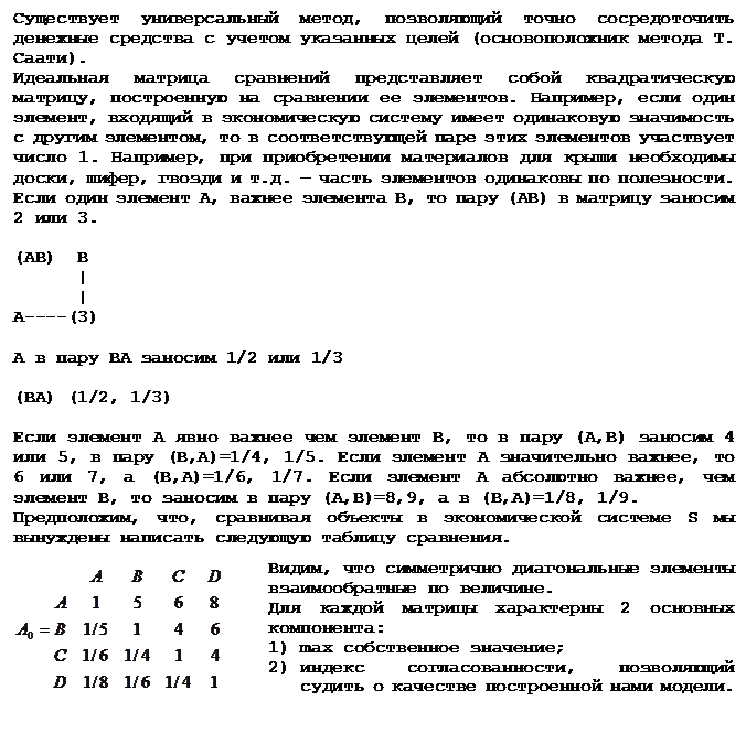1-ый метод. Метод анализа иерархий при принятии окончательных управленческих решений. Суть метода : точно написать дозированные коэффициенты (т.н. весовые) при принятии решения и распределения ресурсов по целям. Для этого потребуются вспомогательные сведения, такие как идеальная матрица сравнения , индекс согласованности решений , распределение согласно целям и иерархии.