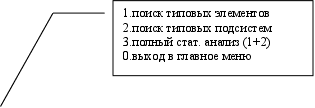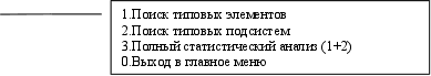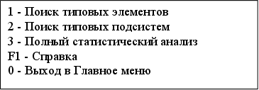 6.2.Меню статистического анализа 1 Поиск типовых элементов 2 Поиск типовых подсистем 3 Полный статистический анализ F1 - справка 0 - выход в главное меню |