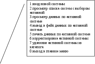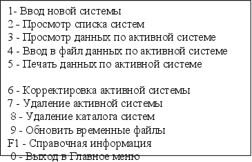 3.1. Меню Работа с системами: 1 Ввод новой системы 2 Просмотр списка систем с выбором активной 3 Просмотр данных по активной системе 4 Вывод в файл данных по активной системе 5 Печать данных по активной системе 6 Удаление активной системы из каталога 7 Удаление каталога систем 8 Обновить временные файлы F1 - справочная информация 0 - выход в главное меню |