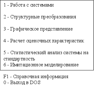 2. Главное меню: 1 Работа с системами 2 Получение логической структуры системы 3 Графическое представление системы 4 Расчет оценочных характеристик 5 Статистический анализ системы на стандартность F1 - справочная информация 0- выход в ДОС |