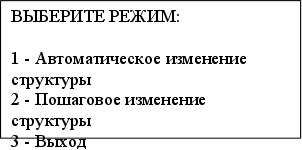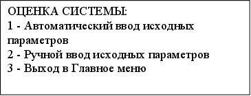 5.2. Меню режимов оценки системы: 1 Автоматический ввод исходных параметров 2 Ручной ввод исходных параметров 3 Выход в главное меню |